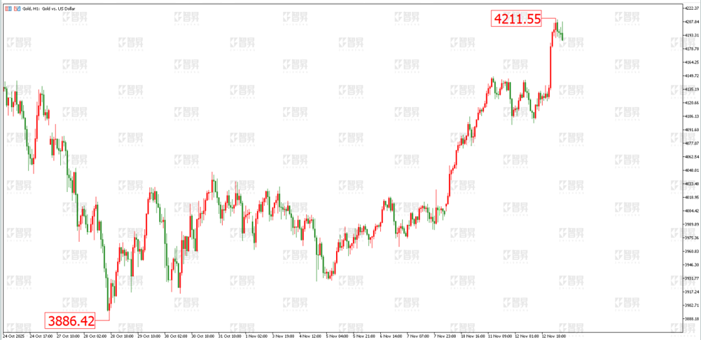 技术面:黄金昨日(11月12日)延续上涨,一度突破4200美元,日线四连阳。小时图来看,上涨结构完好,进一步上涨的概率大。上方可以看向4250美元一线,日内关注4155美元的多空分界线。