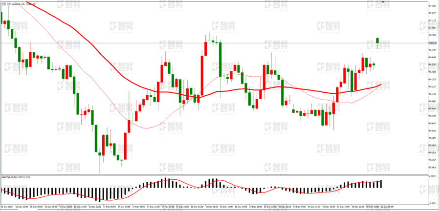 技术面:日线上,近期油价震荡下行整体偏弱势,不过最近两个交易日油价下行有企稳的迹象。指标上看,行情处于20日均线下方运行,空头占优势。日内关注上方58美元一线压力情况。